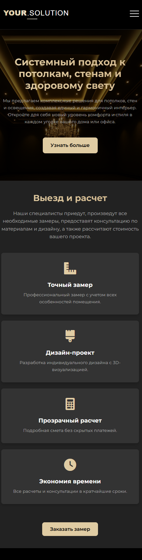 Шаблон YOUR.SOLUTION обладает адаптивным дизайном, что позволяет сайту корректно отображаться на любых устройствах — от мобильных телефонов до больших мониторов. Это обеспечивает удобство использования и улучшает пользовательский опыт.
